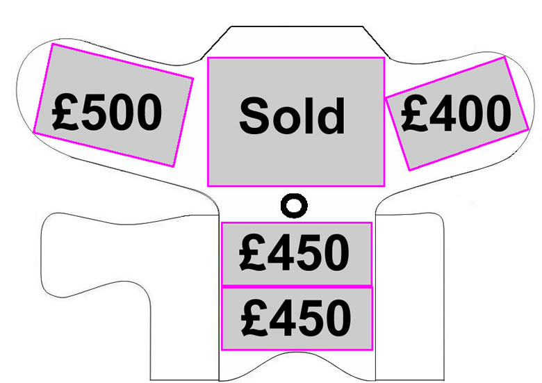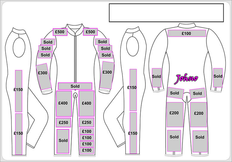 You will also receive a photograph each season and be added to the sponsors email mailing list keeping you up to date with my progress One thing to remember is that you will get tax relief on any amount of sponsorship you give me, there is no limit. This means the amount given will go against your profits for the year, so you wont have to pay so much tax at the end of the year. All this taken into account it means you are getting more for your money advertising with CJ Racing! Below are diagrams of my race suit and bike covers. This shows you how much space and the positioning of where your company logo could go. You can advertise in just position or in a variety of places. You can choose where you want your advert to go so you know what you are getting for your money. If you are considering sponsoring Chris with products to a certain value then you can find an advertising space for that amount and decide where you would like to be on the CJ Racing race gear. All prices on the diagrams are for one seasons advertising. Sponsors will be contacted after each season about the next race seasons sponsorship advertising.